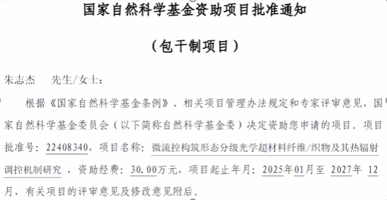8月23日,国家自然科学基金委员会公布了2024年度国家自然科学基金申请项目评审结果。先进纺织工程技术中心研究骨干朱志杰博士申报的《微流控构筑形态分级光学超材料纤维/织物及其热辐射调控机制研究》项目获得青年科学基金项目资助,资助金额30万元。这是中心自然科学基金项目申报的重大突破。
