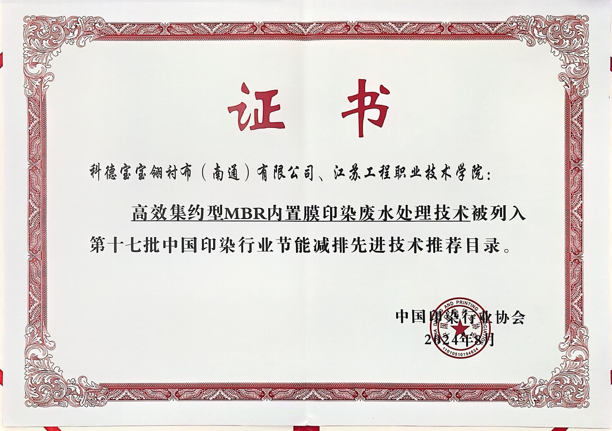 近日,中国印染行业协会发布了《第十七批中国印染行业节能减排先进技术推荐目录》,由我校先进纺织工程技术中心陈志华教授、顾家玉博士等与科德宝宝翎衬布(南通)有限公司共同开发的项目《高效集约型MBR内置膜印染废水处理技术》成功入选,并在2024全国印染行业节能环保年会上作了技术推广。