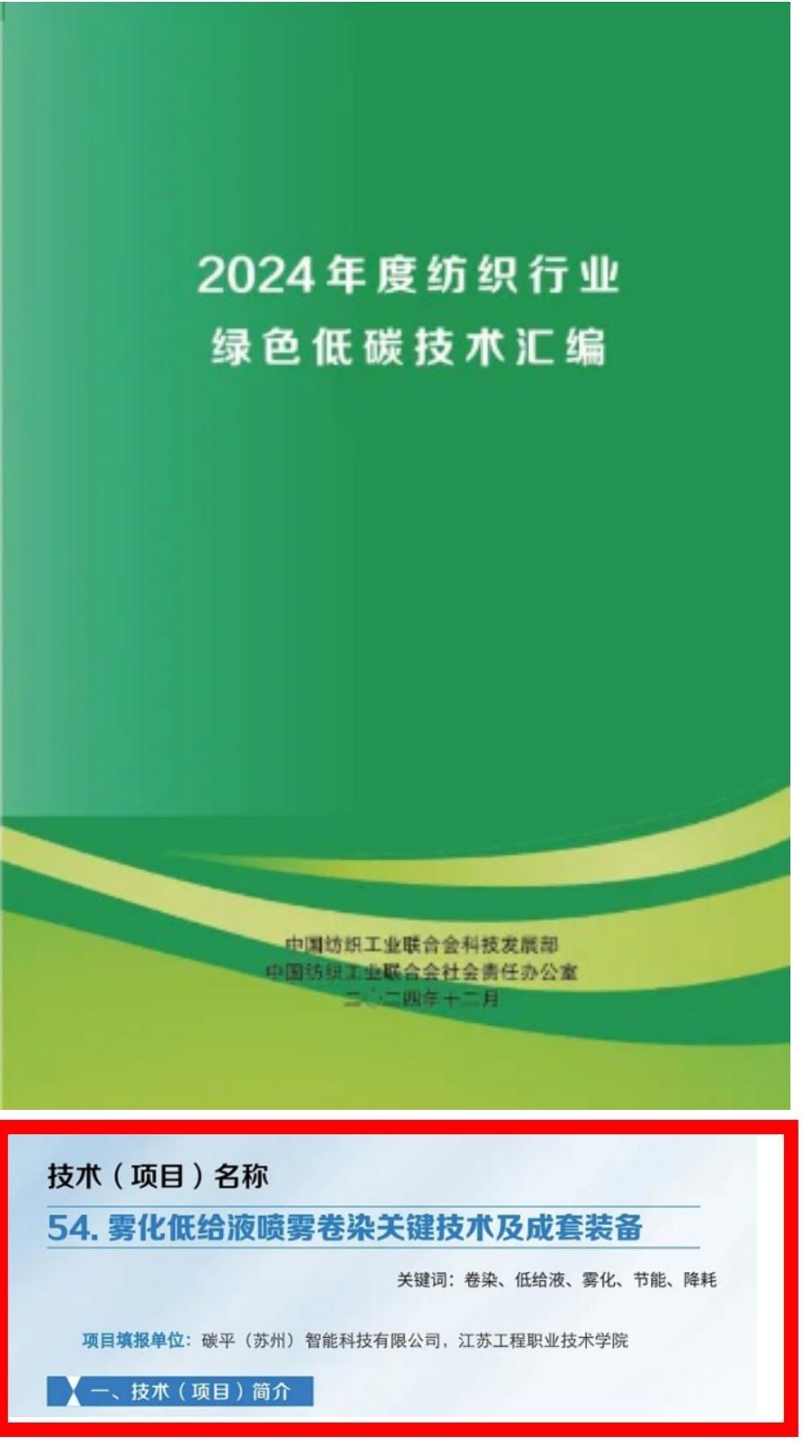此次入选《2024年度纺织行业绿色低碳技术汇编》,不仅是对工程中心纺织绿色研发技术的有力推动,更为江苏纺织行业打造产品全生命周期绿色闭环生产技术体系提供基础项目支撑。未来,工程中心将继续加大在绿色低碳技术领域的研发投入,推动更多创新成果的转化和应用,在科技创新的引领下,不断迈向更加绿色、高效、可持续的未来。(先进纺织工程中心 沈若萍/图文)
